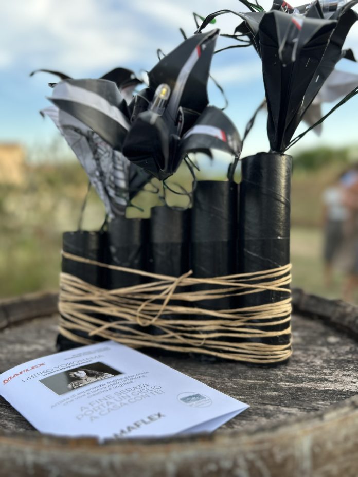 Protagonista l’artista Meiko Yokoyama, che ha reinterpretato i materiali cartacei dando vita a gigli neri luminosi in carta, collocati in vasi realizzati con anime di cartone. Un lavoro ispirato all’origami e al valore della trasformazione.