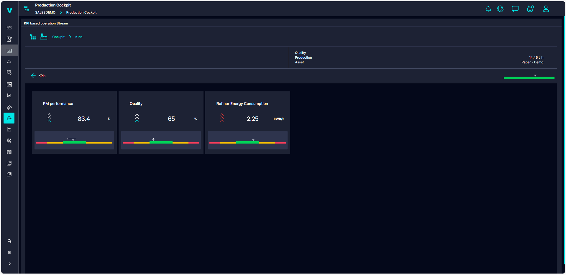 Production Center e Production Cockpit offrono agli operatori strumenti avanzati per monitorare la produzione in tempo reale. Il Production Center fornisce una panoramica immediata dei parametri chiave – velocità media delle macchine, qualità, consumo di vapore e fibra fresca – e un’indicazione visiva delle sezioni che richiedono intervento. Integrando pianificazione personale, attività operative e report di turno, il sistema semplifica la gestione della produzione e la comunicazione tra team.
